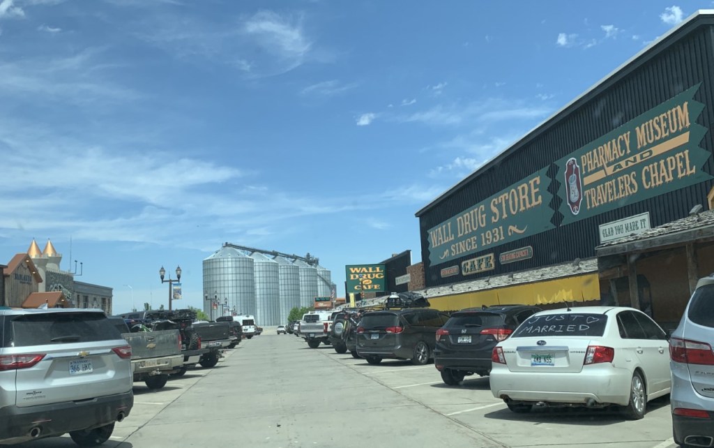 When we arrived, they had just recently opened after being closed for COVID. Few people were inside and we were often the only people in any store. We got ice cream and enjoyed it outside on their patio with the larger-than-life jackalope statue. Wall Drug began in the 1930s and provides ample opportunities to spend money on jewelry, clothes, moccasins, western-wear, food, or carnival-style contraptions such as a “fortune teller”.