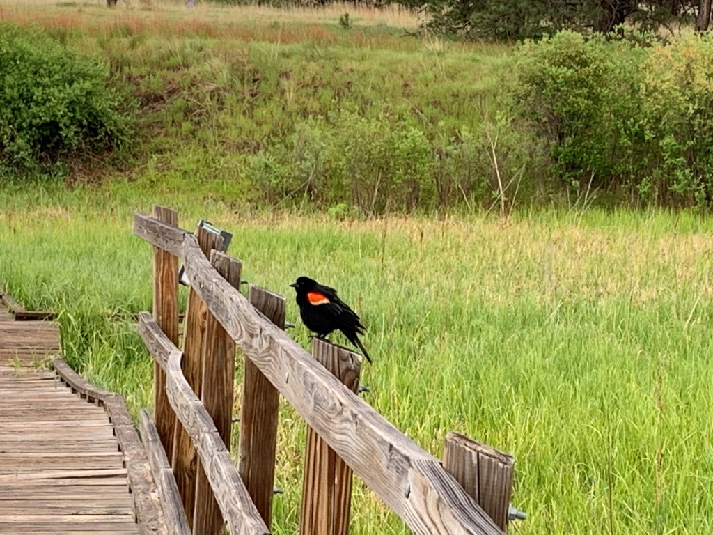 The drive to this campground is easy. Follow the paved road to a well-maintained dirt road close to Manitou Lake. As one of three federal campgrounds in the area, it is not the closest to Manitou Lake, but it is the best. On arriving at our campsite number 16, the camp host came to greet us and let us know he sold fire wood. Site 16 is on the lower loop. Pine trees circle the long back-in driveway and open to a large wildflower-filled meadow. Some of the “painted rocks” sit in the distance, just a quick jaunt across the meadow from the camper.