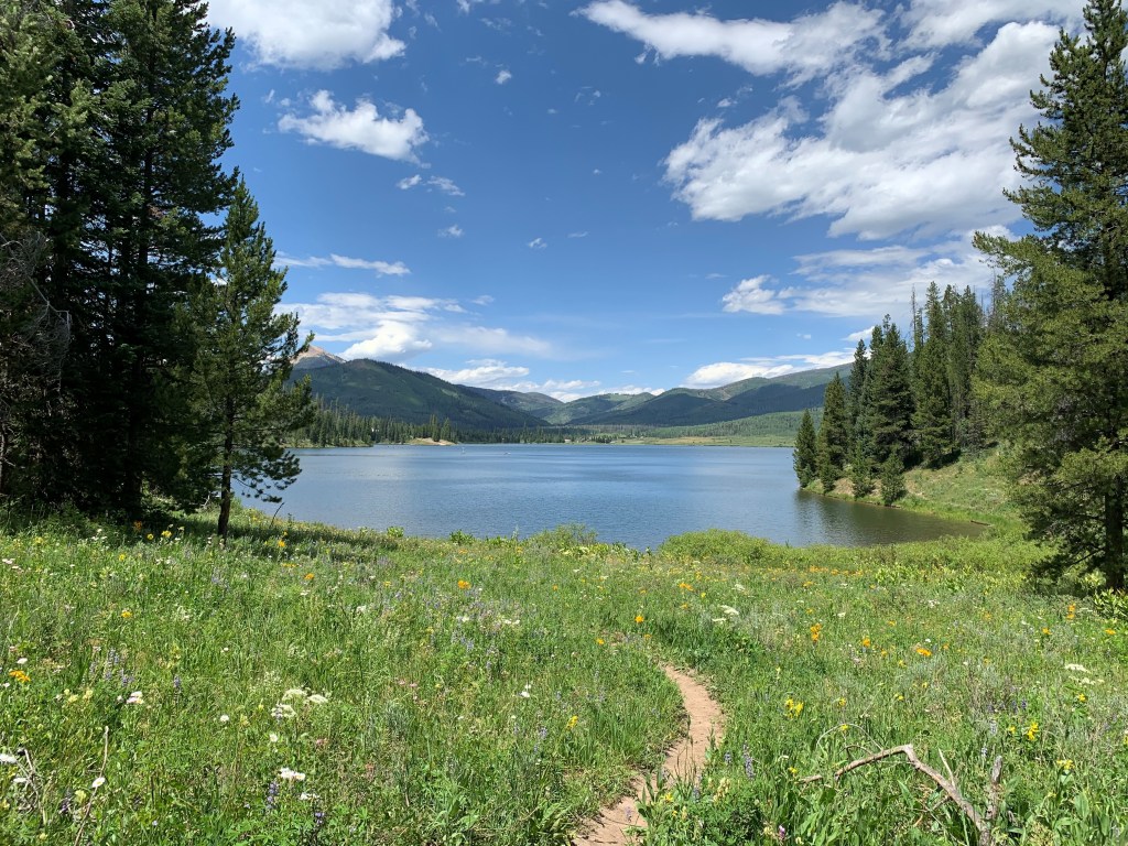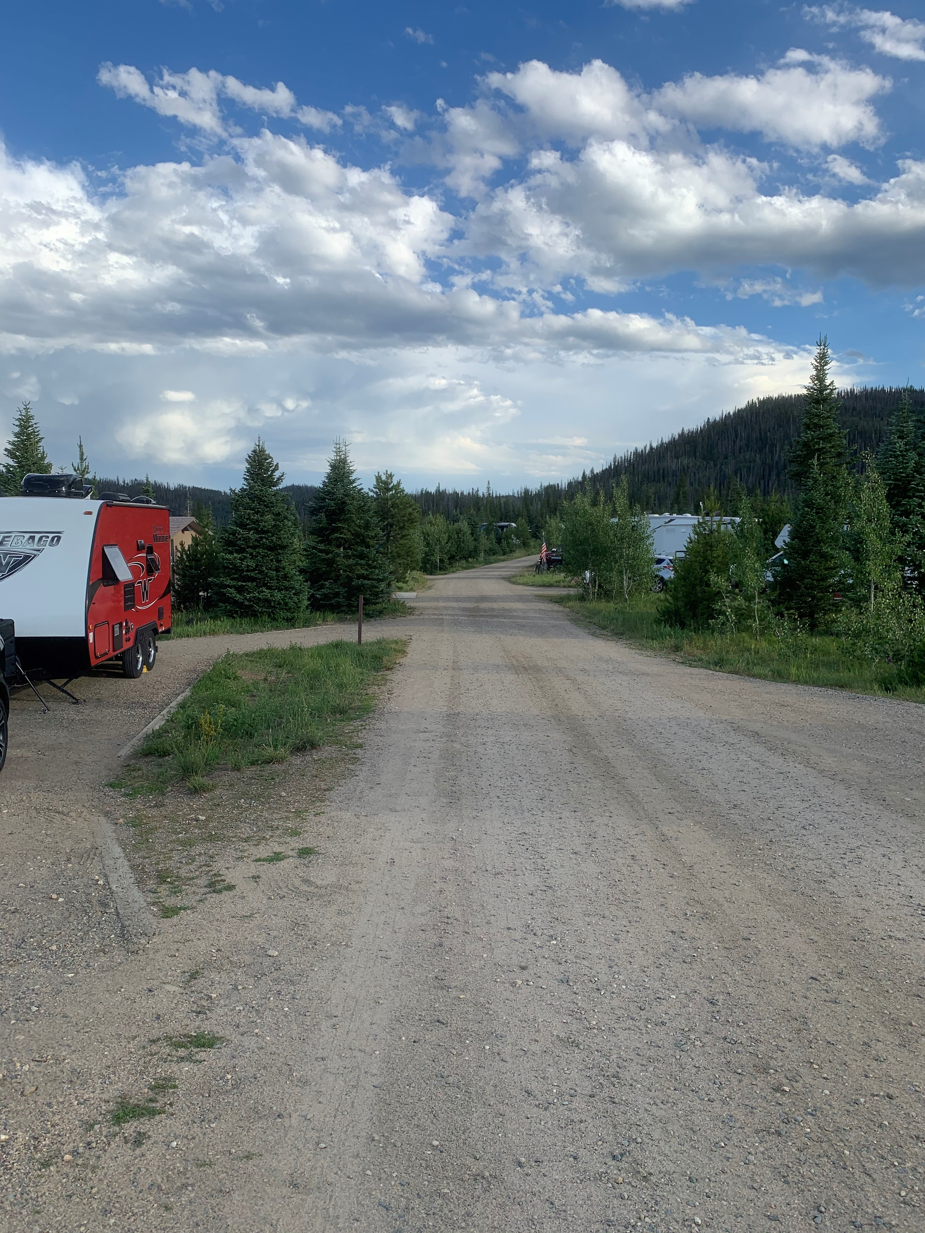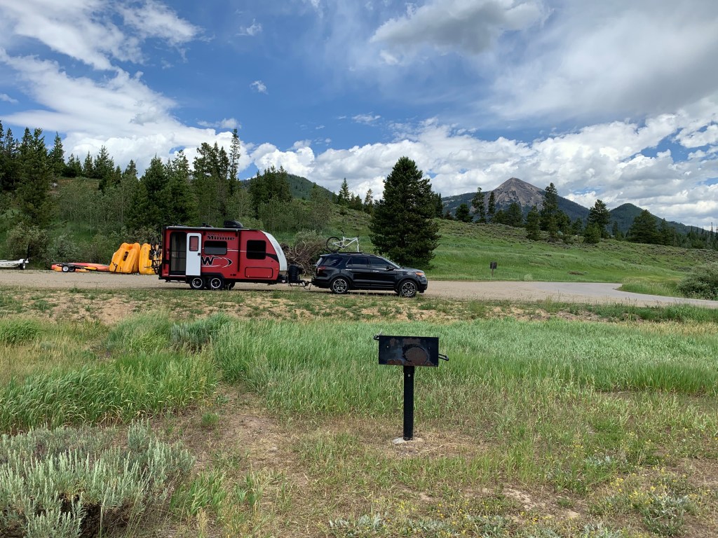 Our camping reservations were at Pearl Lake State Park, a short drive from Steamboat Lake and much smaller. We were too early to check in there, so we headed to Steamboat Lake and a ranger directed us to a great spot to stop for a picnic with a tow vehicle. The views were undeniably the northern Colorado; pine, open meadows, barns, and the lake. We ate our lunches on the banks of the lake as a summer storm began to roll in and the wind picked up. The parking lot, near Dutch Hill Campground, provided ample room for larger vehicles to stop for a quick picnic and easily turn around to exit.