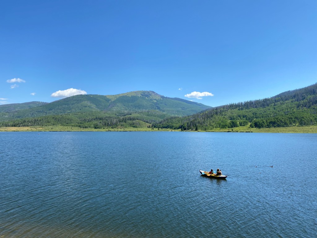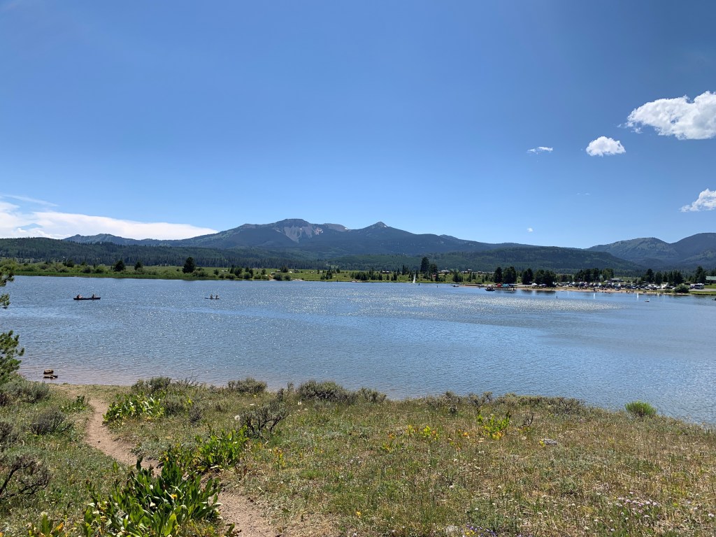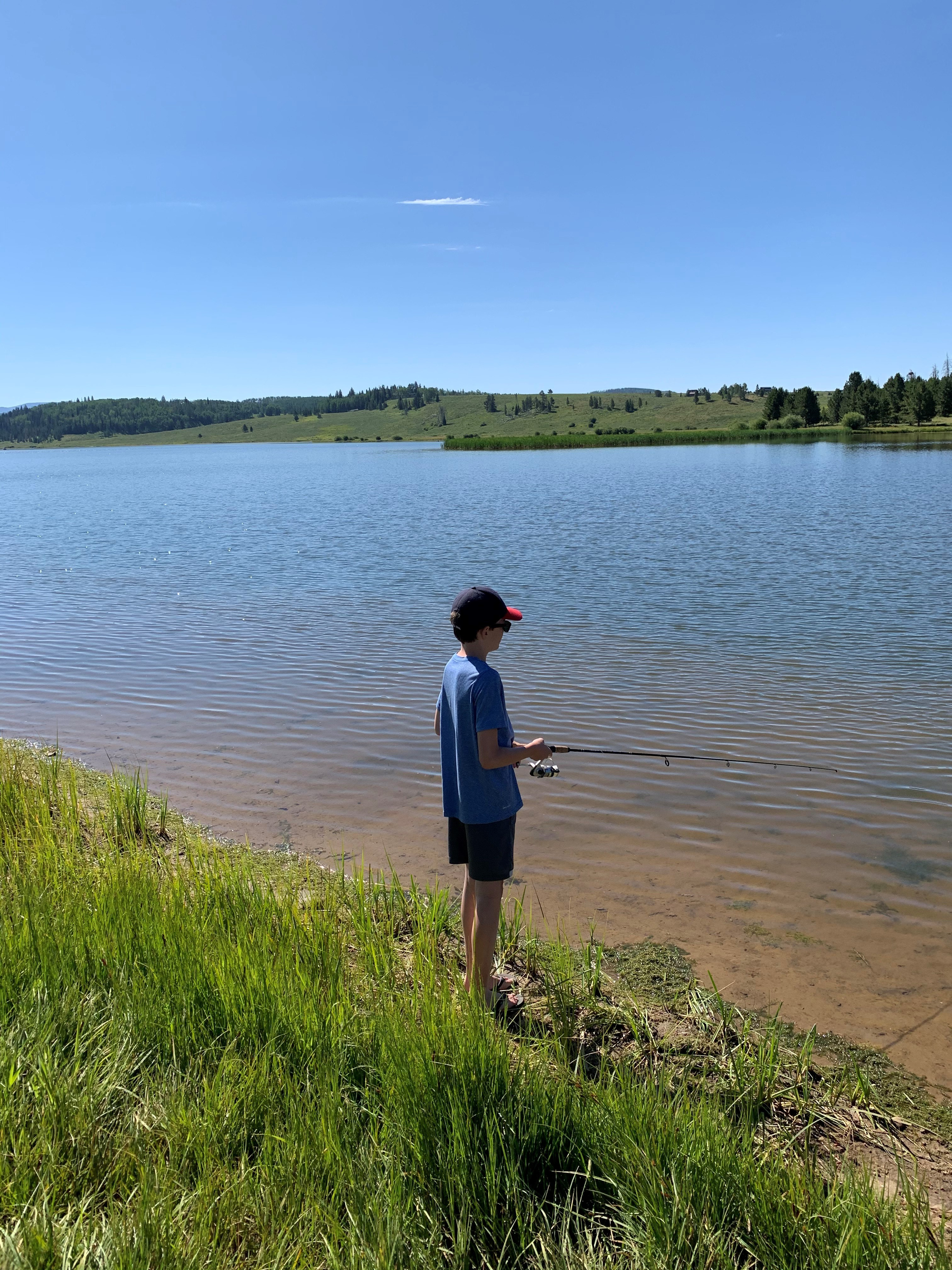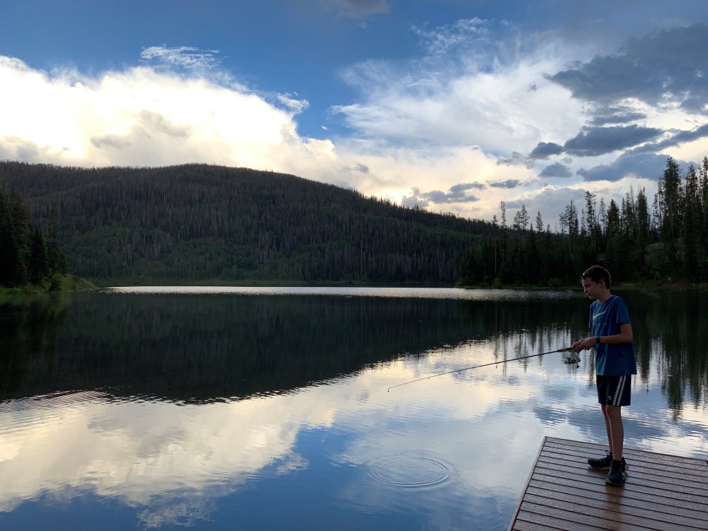 We drove the camper to Steamboat Lake in the morning and pulled into Meadow Point, an area that the ranger told us was a great fishing spot. Cars were there and people, well-spaced, were trying their best to catch fish in this inlet. We approached and found a spot on the shore and began our quest to catch a fish in these beautiful waters. It was not particularly successful at first and, within the hour, the other people decided to pack up and leave empty handed. This was our activity until lunchtime, so we luckily decided to stay and continue fishing. My son caught a beautiful trout, but we decided to take a picture and throw it back. Then, on my last attempt (when my family was packing up to go back to the camper and make lunch), I felt that perfect tug and reeled in another beautiful trout. This one we kept and enjoyed later that evening for dinner.