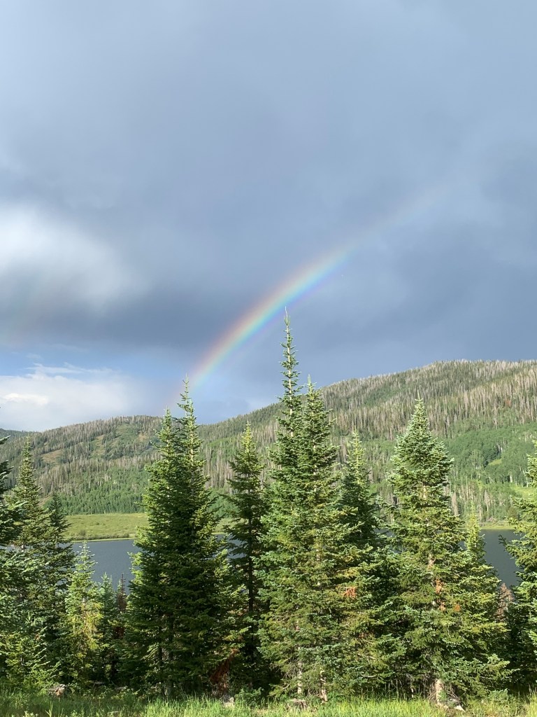 Each site is equipped with a fire ring, tent pad and picnic table. There is no electricity and cell services is difficult, if not impossible. There is also no dump station, but campers at Pearl Lake can use the dump station at Steamboat Lake. Each site is also quite large with trees and underbrush. The sites on the ridge have views of the lake to the East, as ours did, or the mountains to the West with amazing sunset opportunities. After we set up camp, the pending summer thunder storm rolled in long enough to cool down the temperature. It was fast, as usual here, and were soon enjoying views of the rainbow that hung over the mountain behind the lake.