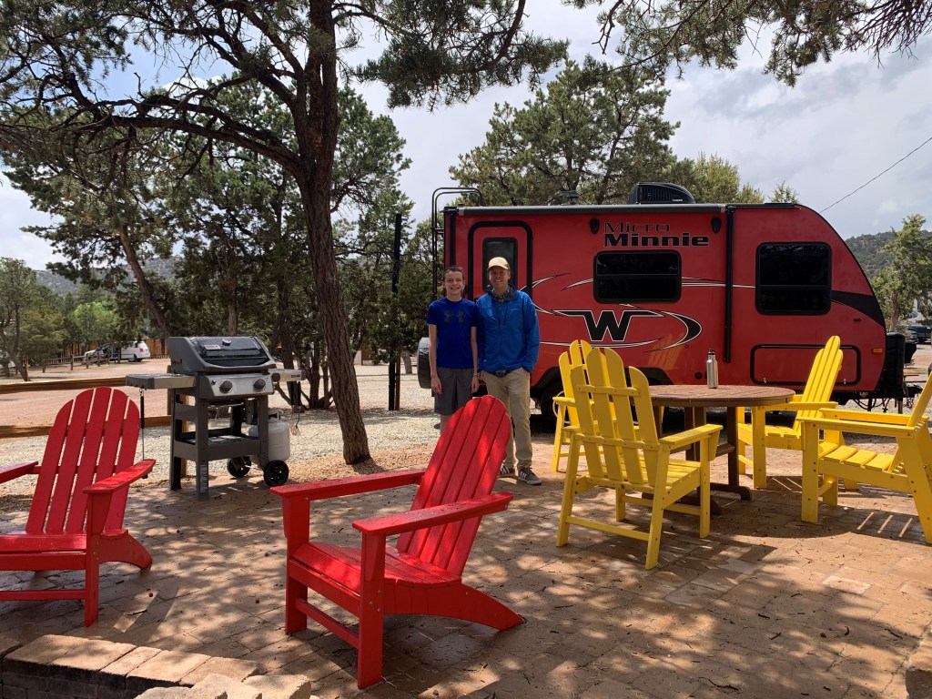 Santa Fe KOA premium campsite with patio, grill, and fire pit, plus furniture.