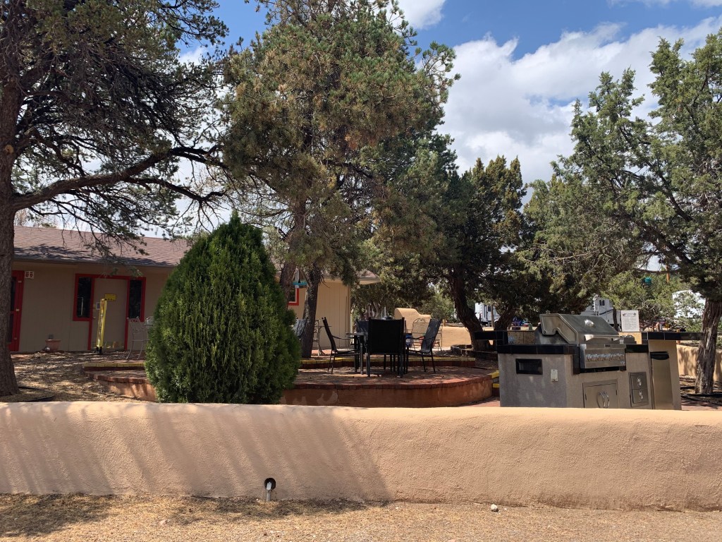 We encountered hail and rain on our drive into Santa Fe from Colorado. Quickly, we followed the directions to the Santa Fe KOA off I-25. Low-growing shrubs and trees were abundant as we exited the freeway and drove the short mile to check in at this KOA. Freeway noise was minimal despite being close. We were warmly greeted and shown to our campsite, a newer patio site with a fire pit, gas grill, table, and chairs. They have a few of these sites, but the one we stayed in was near the entrance to the campground. The site had trees for shade and was across the driveway from a play area and the main building. The spot was always bustling with activity, but it was quiet and calm in the evenings.