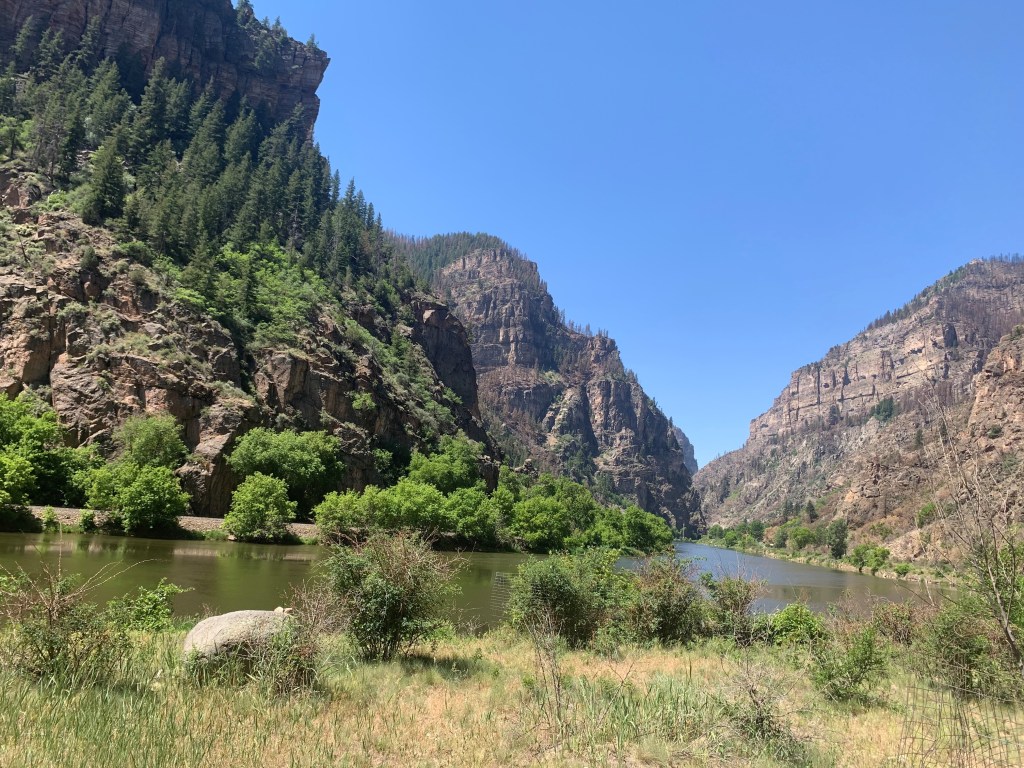 We also traveled to town to rent bikes from Canyon Bicycles and ride on the Glenwood Canyon Bike Trail. This trail closely follows Interstate 70 (though it is separate from the interstate) and the river. During early June, the river was flowing rapidly and several people were rafting the river on our bike ride. Canyon Bicycles offers a tour that takes bikes and riders to a starting point on I-70 and then riders ride one direction (mostly downhill) back to Glenwood Springs. This is an easy ride that includes various rest areas and picnic stops along the way. We completed the ride in a couple hours, just in time for lunch in downtown Glenwood Springs. This area has suffered both a catastrophic fire and, after our visit, a flood and landslide, that have altered the path of this bike ride since we completed it in June 2021.