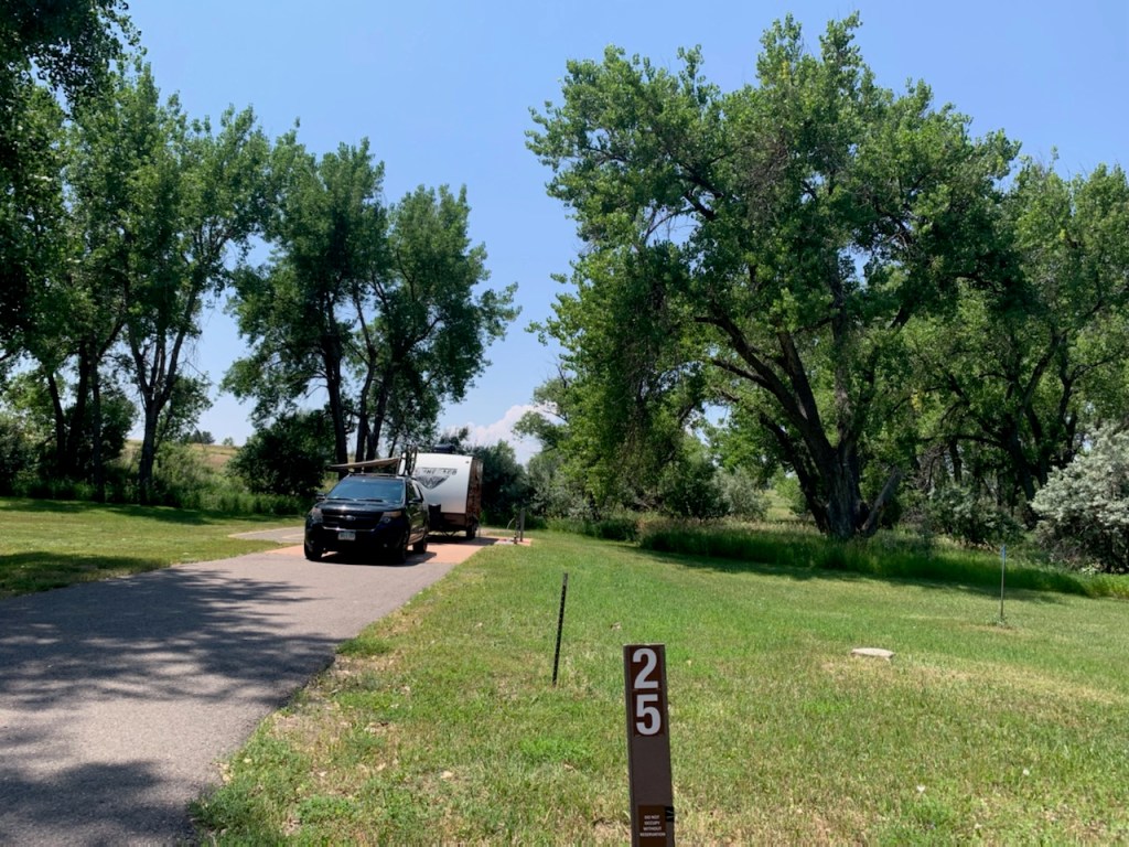 I have written about this campground in the past, so this review will specifically be for campsite 25. Cherry Creek State Park has a wealth of outdoor options for anyone to enjoy. These include paved bike trails that circle the Cherry Creek Reservoir or connect all the way to Castlewood Canyon State Park, sail boats, picnic areas, fishing, and playing on the swim beach. Hiking closer to the lake, educational programs, clean camper services buildings and a visitors center round out the experience. Whether you have an hour or a week, this campground will not disappoint.